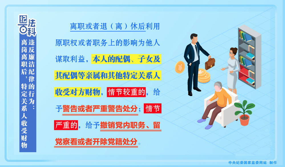 基本解释:《中国共产党纪律处分条例》第一百零六条第二款规定,离职或者退(离)休后利用原职权或者职务上的影响为他人谋取利益,本人的配偶、子女及其配偶等亲属和其他特定关系人收受对方财物,情节较重的,给予警告或者严重警告处分;情节严重的,给予撤销党内职务、留党察看或者开除党籍处分。