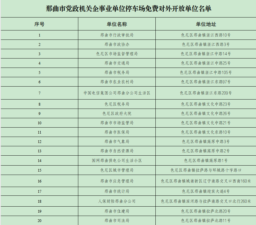 附:那曲市党政机关企事业单位停车场免费对外开放单位名单