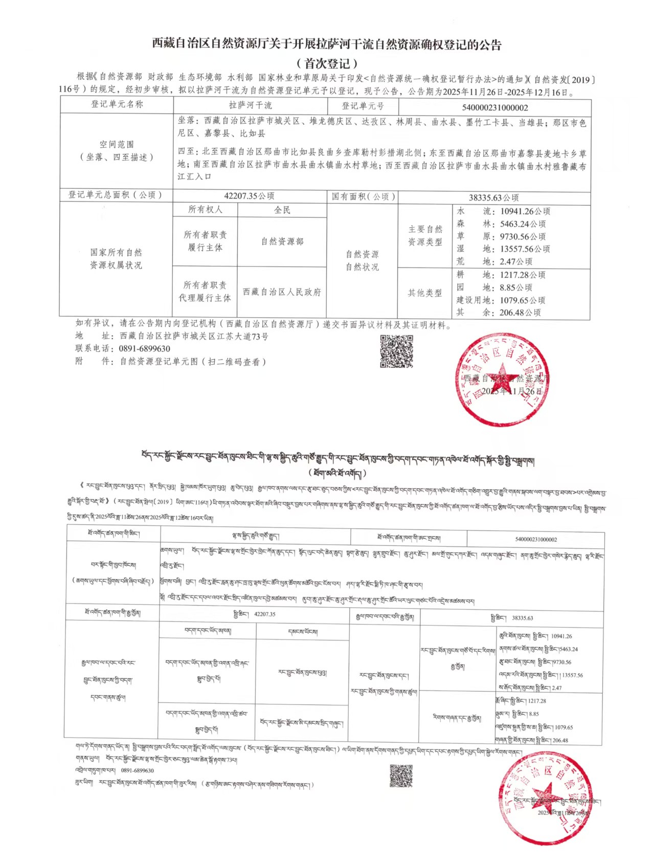 西藏自治区自然资源厅关于开展拉萨河干流自然资源确权登记的公告
